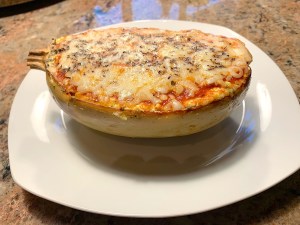 - Layer 1/3 of the squash strands, then cheese mixture, then marinara sauce into the two empty squash shells