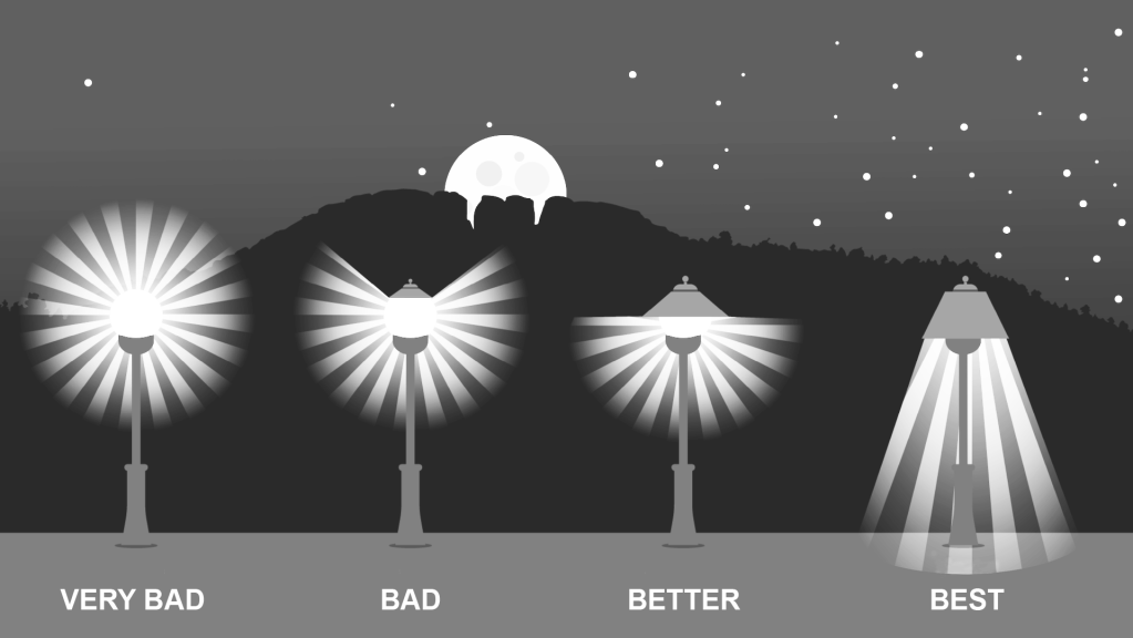Light pollution happens when artificial outdoor lighting ends up in the wrong place or there is too much of it. It’s easy to find examples: a residential floodlight that keeps neighbors awake, a gas station that’s brighter at night than during the day, lights over an empty parking lot blazing at three in the morning, or poorly-aimed street lights that blind drivers. The fact is that most outdoor lighting is neither efficient nor effective. Millions of budget dollars and tons of scarce energy resources are wasted every year due to poorly designed outdoor lighting.